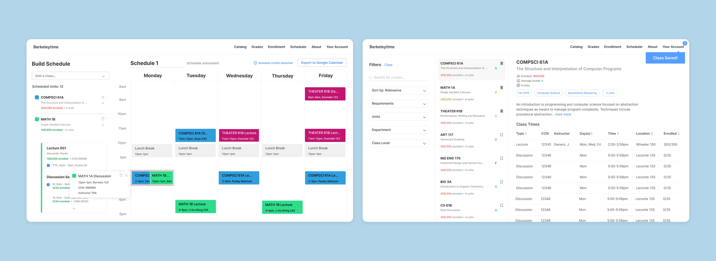 Hi, I’m Junghyun. Product designer with strong focus on simplifying convoluted workflows into intuitive, user-friendly solutions for B2B and AI.I connect the dots between people, technology, and business to understand and re-imagine the systems we are part of. Featured Projects. Berkeleytime Scheduler Designed and shipped a class schedule builder, streamlining class enrollment for 26,000+ students. Aether: AI for Honda Research Institute Designed a 0-1 AI research assistant to reduce time researchers spend on repetitive tasks.