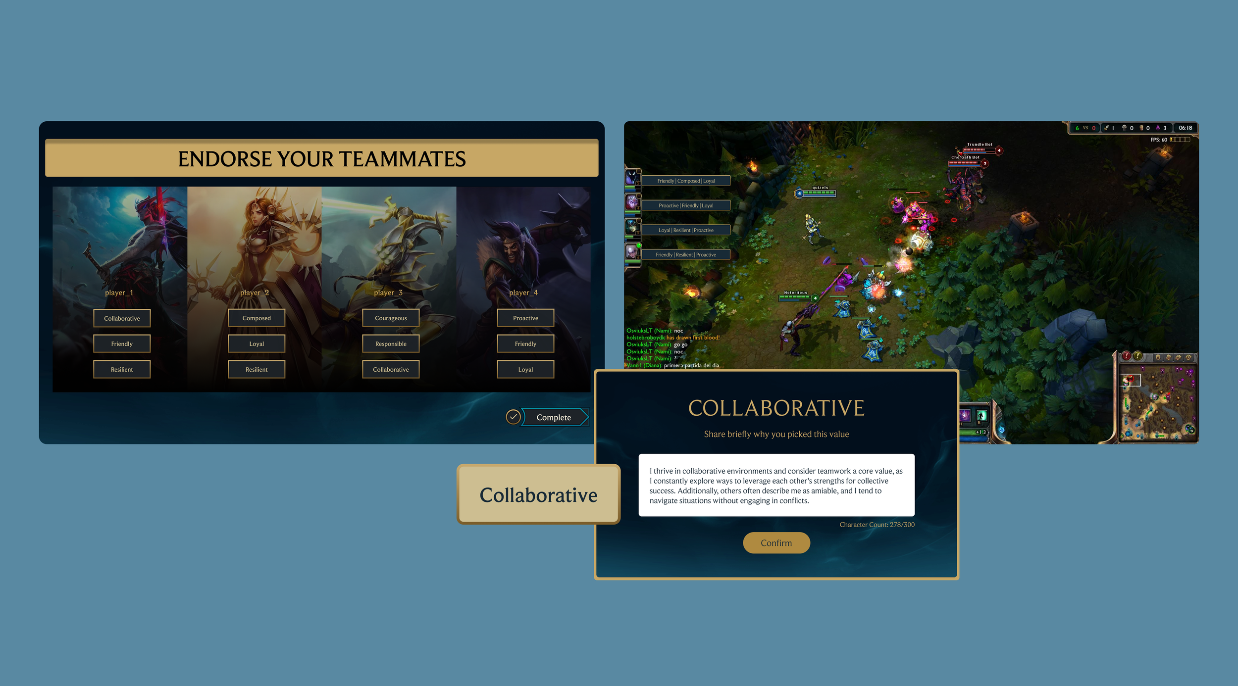 One of the biggest constraints of the initial project timeline was not having the time to test the values system with a bigger participant pool. In the next few months, we recruited League of Legends players across the US to try out our system during their matches and tell us their thoughts and takeaways through weekly interviews.