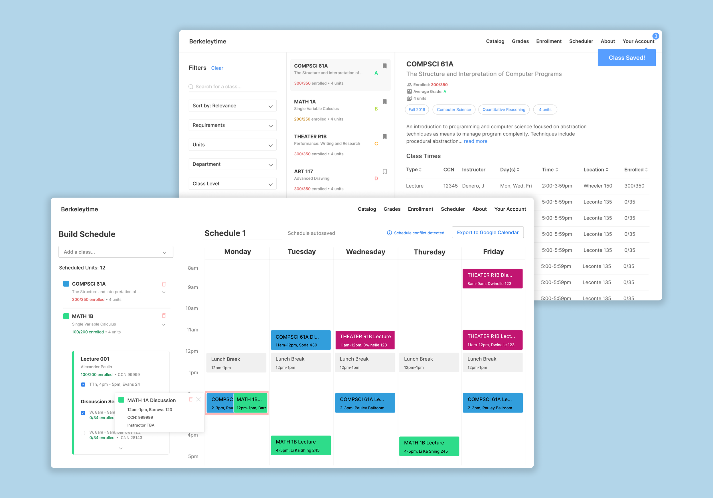 Designed and shipped a class schedule builder, streamlining class enrollment for 26,000+ students.